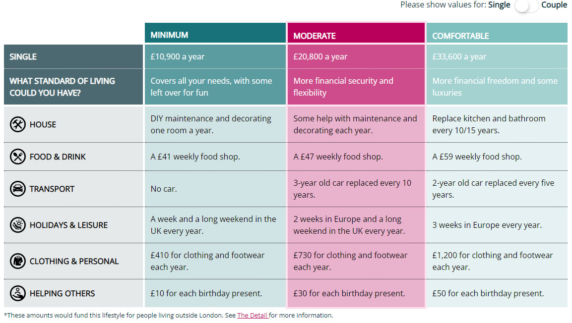 MoneyHelper takes a different approach and suggests a range based upon your current income; generally, the lower the income you’re on, the higher the proportion of that income is needed in retirement. - Using the PLSA Retirement Living Standards as a guide of what a minimum, moderate and comfortable level of income look like, using today's standards. Deeper dive: